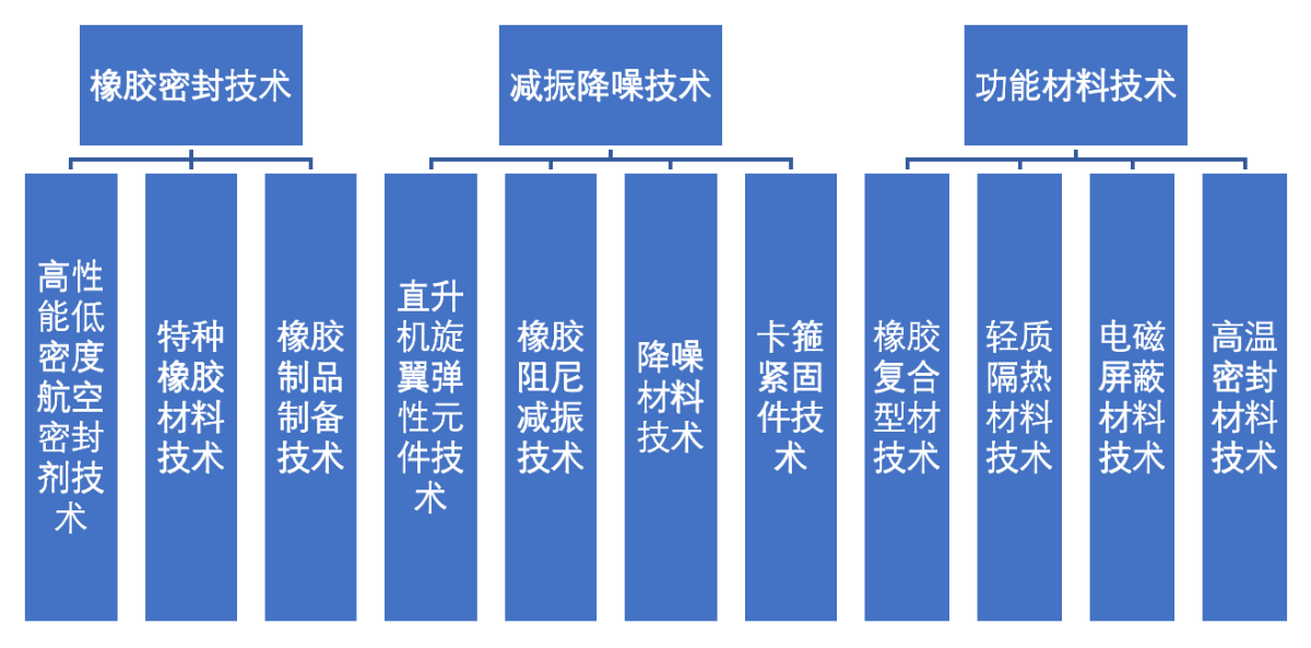 橡胶与密封材料事业部在氟、氟醚、硅、氟硅、导电、电磁屏蔽、防火隔热等特种橡胶材料及航空密封剂方面研制技术处于国内领先地位。在封严结构材料、弹性元件方面掌握多项达到国际先进或国内领先水平的核心技术,打破国外在该等领域的技术垄断。