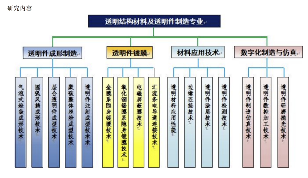 事业部主要研究方向包括高性能飞机座舱透明材料应用技术、先进座舱透明件成形与制造技术、透明件镀膜技术、边缘连接技术等,涉及材料、力学、光学、薄膜技术等众多学科,是航空制造工程中高难度、多学科交叉、多工序的长线专业,现事业部已逐步发展为专业研究方向全面、研究水平较高和具有一定规模的飞机座舱透明件研制与生产基地。曾获得国家级发明奖、科技进步奖以及部级科技进步奖等数十项成果与荣誉,为我国航空透明材料研制与应用做出了重要贡献。